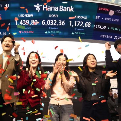 Published: 25 Feb. 2026, 13:54 Updated: 25 Feb. 2026, 14:10 Employees celebrate in the dealing room of Hana Bank’s headquarters in Jung District, central Seoul,