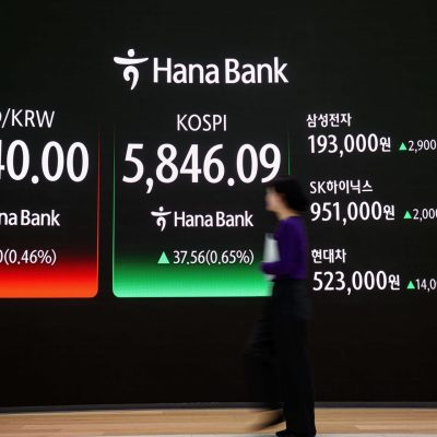 An electronic trading board at Hana Bank headquarters in central Seoul shows the benchmark KOSPI closing at 5,846.09 points, Monday, up 37.56 points, or 0.65