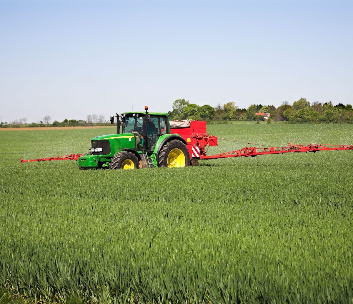 A tractor spraying nitrogen fertiliser on winter wheat.