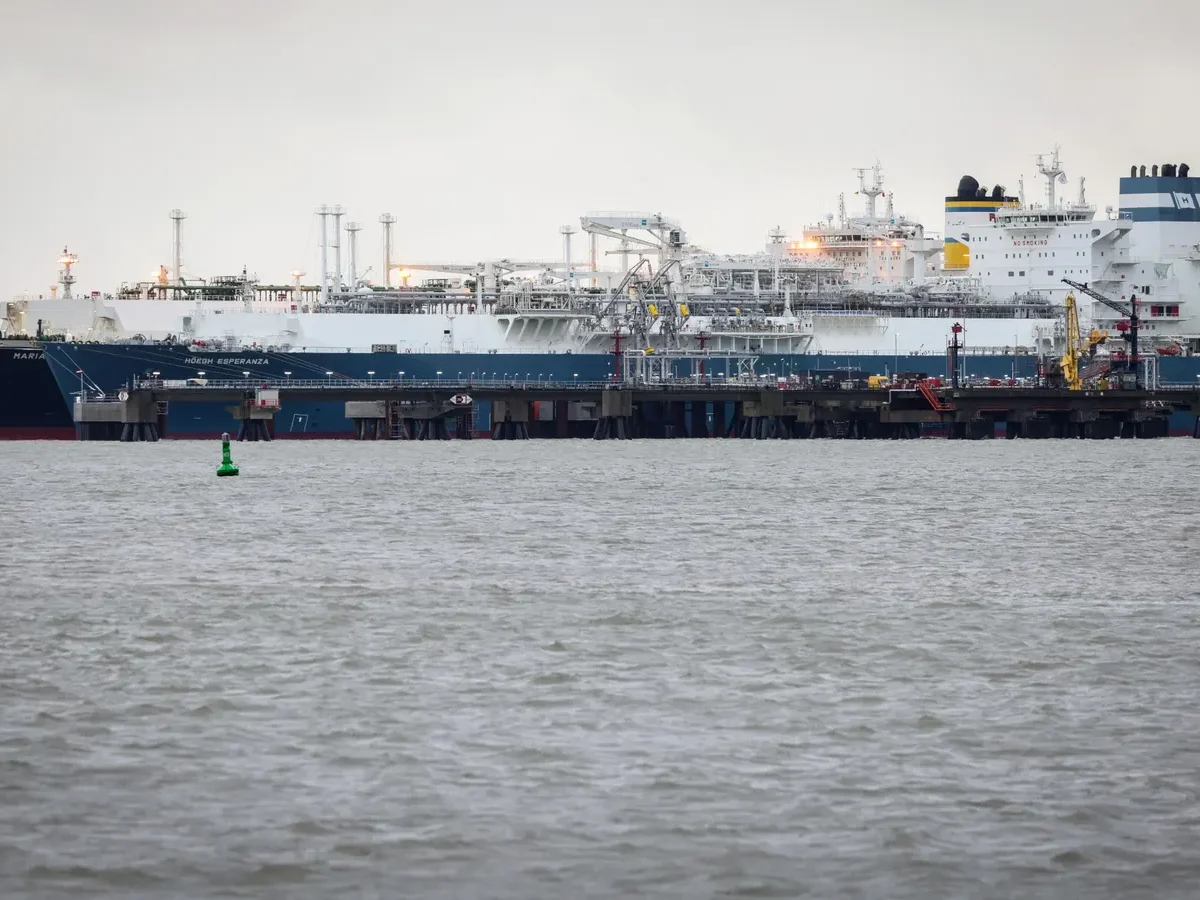 The Liquefied Natural Gas (LNG) tanker Maria Energy (background) is moored alongside the Floating Storage and Regasification Unit (FSRU) vessel Hoegh Esperanza (foreground) at the Uniper LNG terminal at the Jade estuary in Wilhelmshaven, northern Germany, on January 4, 2023. – The Maria Energy delivers LNG produced from fracking in the United States and is the first vessel arriving at the LNG port of Wilhelmshaven. (Photo by FOCKE STRANGMANN / AFP) (Photo by FOCKE STRANGMANN/AFP via Getty Images)