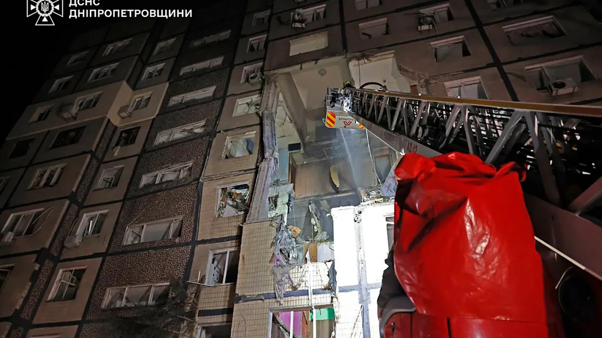 A fire broke out and several apartments were destroyed in the nine-storey building in Dnipro, the emergency services said. Rescuers recovered the bodies of three people, while two children were among the injured.