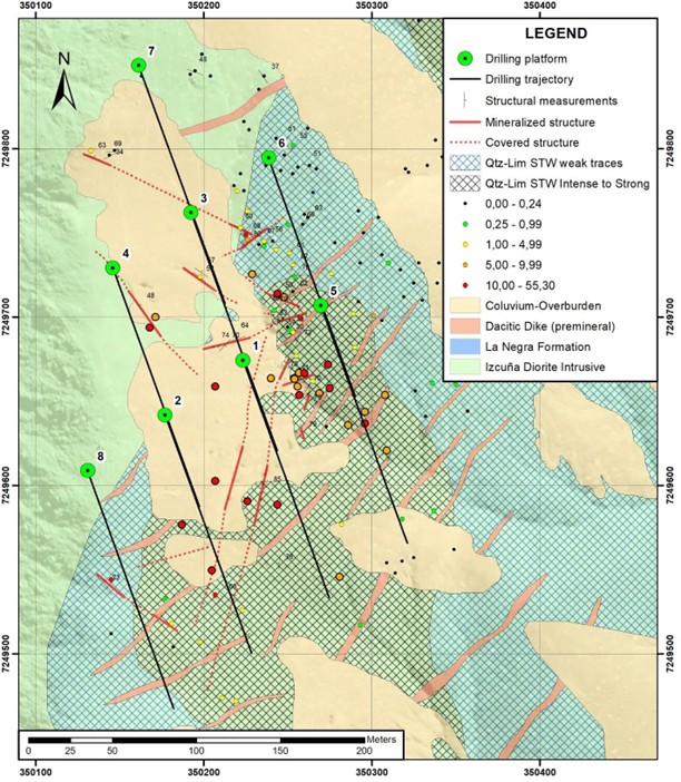 - High grade mineralization continues to exhibit a strong structural control. Halcones management believes there is potential for a larger tonnage surface deposit of vein and stockwork hosted mineralization hosted by the highly fractured rocks associated with fault splays associated with the continental scale, Atacama Fault System in the area.