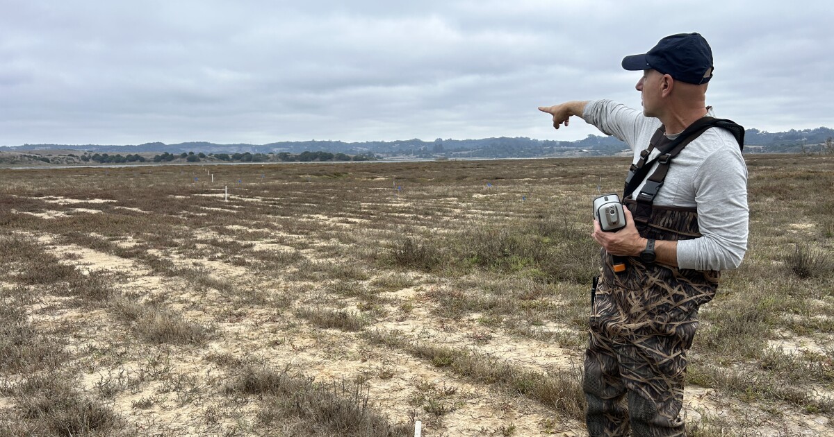 On a cloudy day in September, Ivano Aiello walks through tall grass at Elkhorn Slough Reserve, right next to the Moss Landing Power Plant.