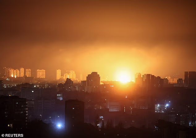 An explosion lights up the cityscape during Russian missile and drone strike, amid Russia’s attack on Ukraine, in Kyiv, Ukraine November 14, 2025