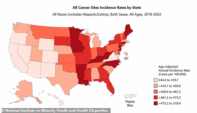 This same region of the country sees the highest burden of cancers compared to the rest of the nation, with incidences ranging from 472 cases of cancer for 100,000 people in Georgia to 476 cases per 100,000 people in Arkansas.