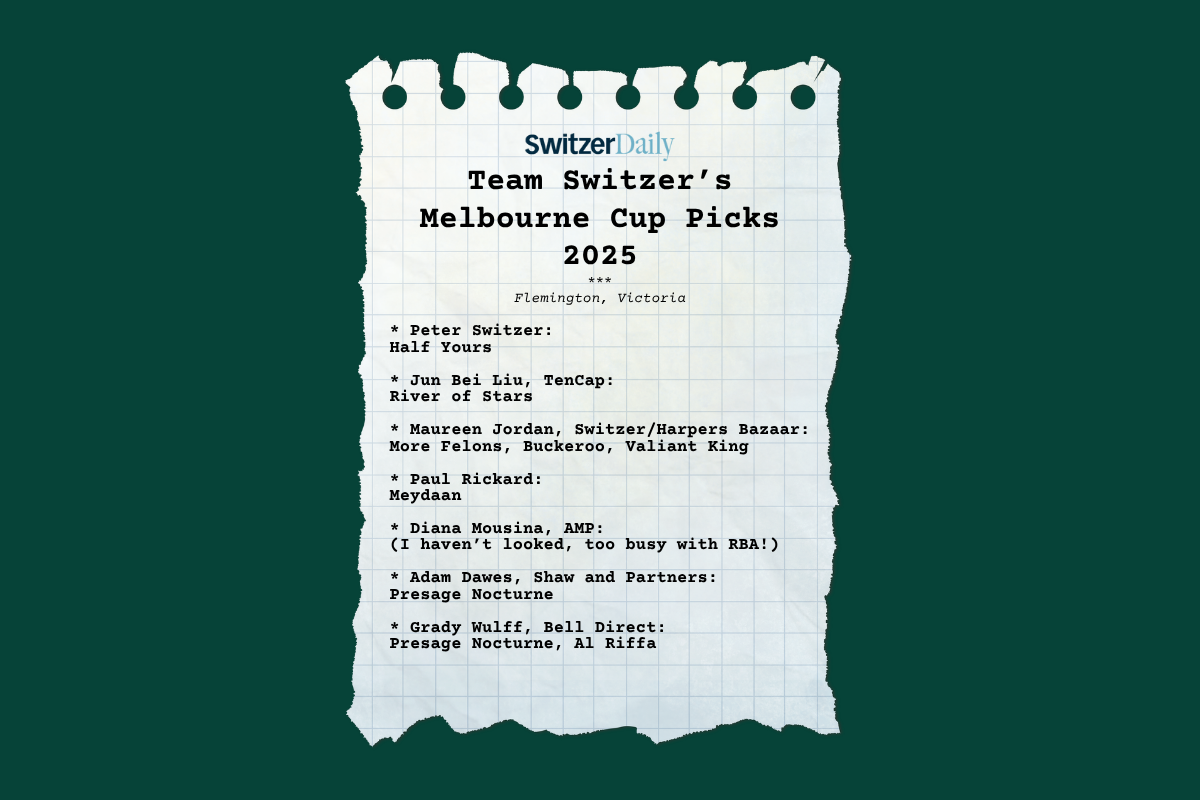 Peter Switzer is backing Half Yours, while TenCap’s Jun Bei Liu likes River of Stars. Switzer Group’s Maureen Jordan is taking a spread with More Felons, Buckeroo and Valiant King, and veteran investor Paul Rickard is throwing his support behind Meydaan. Shaw and Partners’ Adam Dawes and Bell Direct’s Grady Wulff are united on Presage Nocturne, with Wulff also adding Al Riffa to her quinella hopes. AMP’s Diana Mousina, ever the economist, said she’s “too busy with the RBA” to call it — a sentiment many market-watchers might share this week. She did message me a few hours later, however to say she “asked ChatGPT”, which gave her the favourite: Half Yours.