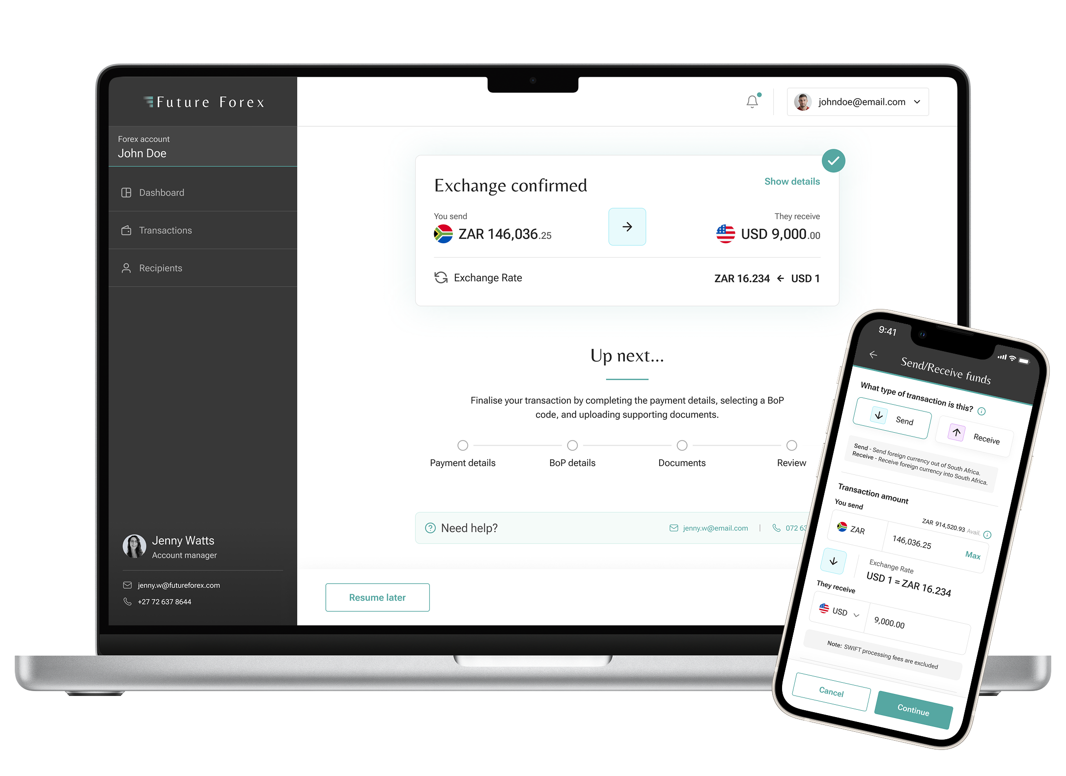“For our business clients, our team effectively becomes your dedicated forex department. “We assist with everything from SA Reserve Bank approvals to Balance of Payments codes (BoP) and Advance Payment Notification (APN) applications – all included in our service at no extra cost.”