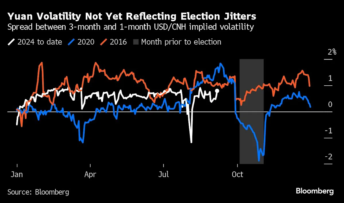 For the yuan, that spread is now around 80 basis points, below July levels. For the euro, it’s now around 45 basis points, also well within its range since mid-2023. The yuan, as an example, trails similar readings from the 2020 and 2016 election cycles.