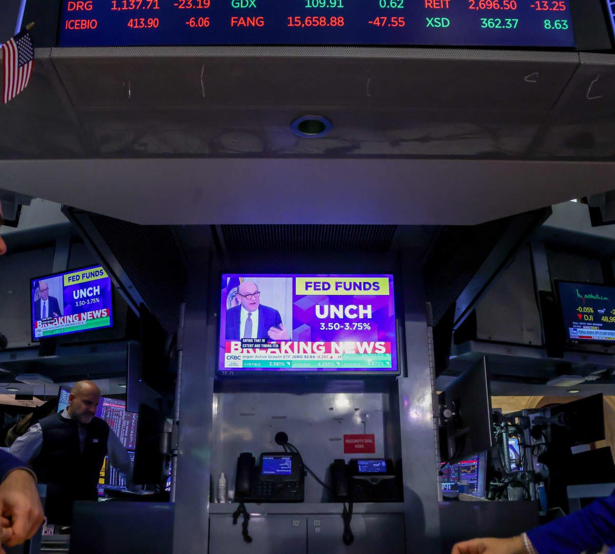 A television station broadcasts the Federal Reserve’s decision to hold rates after a Federal Open Market Committee (FOMC) meeting on the floor of the New York Stock Exchange (NYSE) in New York, US, on Wednesday, Jan. 28, 2026.