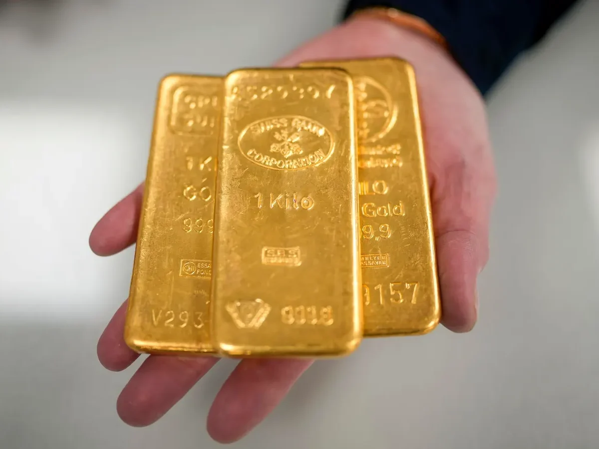 BIRMINGHAM, ENGLAND – DECEMBER 13: A jewellery quarter gold dealer poses with three 1kg gold bullion bars on December 13, 2023 in Birmingham, England. Gold prices have increased since the Ukraine War but have soared to record highs since the start of the Hamas-Israel war. Other factors are the weakening US dollar and expected rate cuts from the Federal Reserve. (Photo by Christopher Furlong/Getty Images)