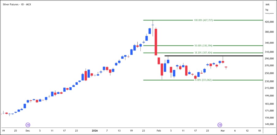 Silver fell to Rs 2,34,000, but then it went back up to Rs 3,00,000. The bounce came to an end close to the 38.2% Fibonacci retracement. With multiple rejections at Rs 3,00,000, it shows that sellers are looking for an opportunity to create a supply at higher levels. If a market can’t break through a psychological level again and again, it means that buyers aren’t sure.
