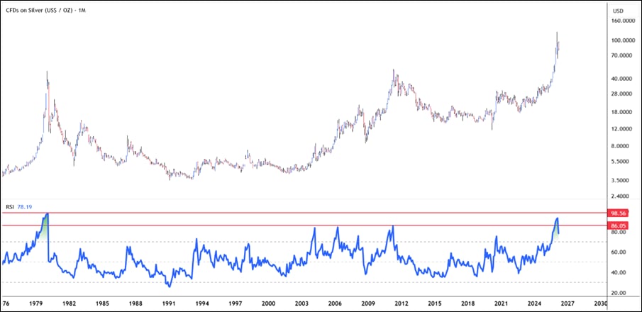 The RSI (Relative Strength Index) on the monthly chart of COMEX Silver went down right after the $121 high.
