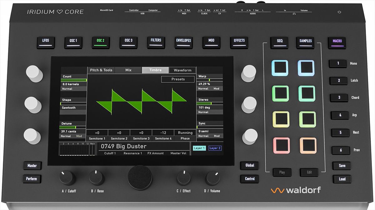 To recap, that Iridium engine features three oscillators, five synthesis models (wavetable, multisample/granular, waveform, resonator and kernel), filters, a 40-slot mod matrix with LFOs and envelopes, effects, an audio recorder and more. As on previous iterations of the synth, these features can be accessed from a combination of a touchscreen, buttons and knobs.