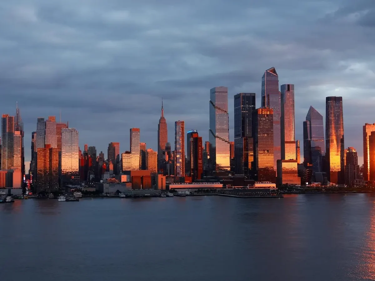 WEEHAWKEN, NJ – SEPTEMBER 22: The sun sets on the skyline of midtown Manhattan, the Empire State Building, and Hudson Yards in New York City, as seen from Weehawken, New Jersey. (Photo by Gary Hershorn/Getty Images)