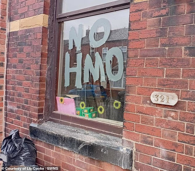 Liv Cooke, a millionaire property tycoon who owns HMOs around Britain, has been targeted by vandals daubing the words ‘No HMO’ in large grey letters over its front door and window