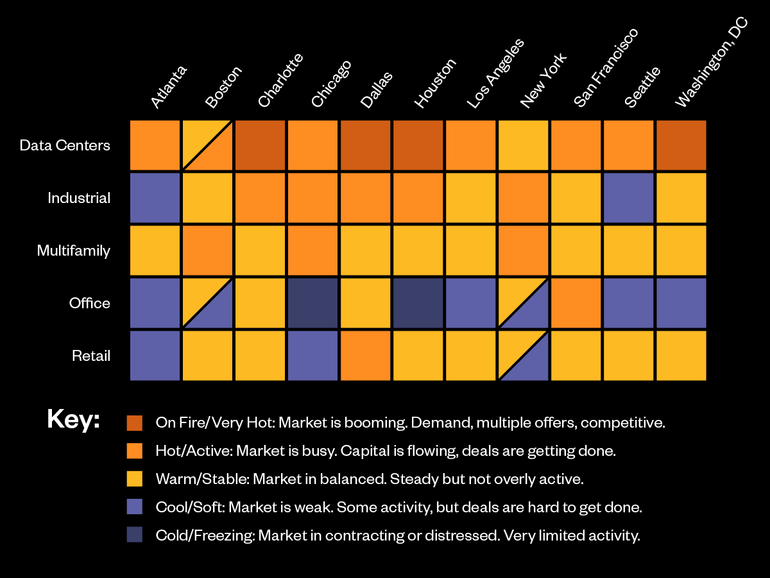 Market Trend: Markets are increasingly splitting between well-located, high-quality assets that continue to draw interest and properties that need updates or repositioning, particularly in office and retail. Population growth and corporate relocations are still fueling momentum in places like Dallas, while AI-driven investment is lifting activity in tech-focused regions such as San Francisco and Boston.