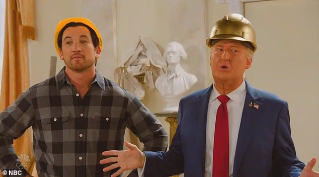 Saturday Night Live turned the White House into a construction zone this weekend as host Miles Teller, left, worked with James Austin Johnson's President Donald Trump, right