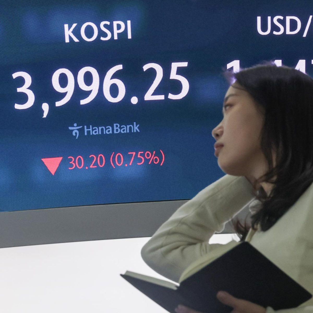 An electronic trading board shows the benchmark KOSPI trading at 3,996.25 points during intraday trading on Friday. Yonhap