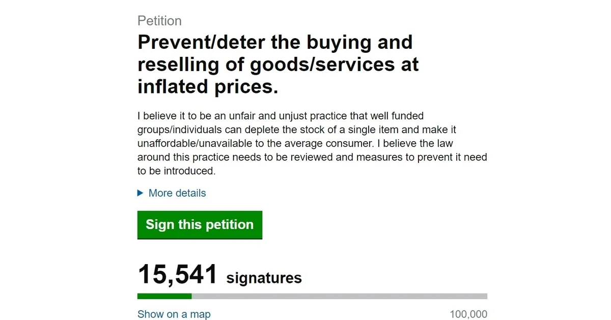 “Both pre-orders and launch day stock were sold out instantaneously and then thousands of listings appeared on eBay at over double the RRP,” the petition reads. “A reseller group claimed to have been able to secure 3500 of these.”